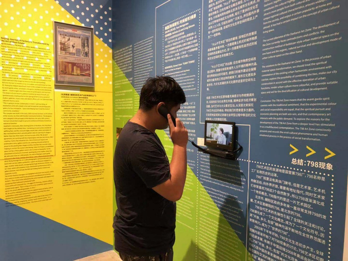 一部部“视频电话”伴随着798艺术区的大事记演进轴嵌入在一面面展览墙上。观展人拿起听筒,就能听到早期进驻798的艺术家、艺术机构负责人、原798厂物业经理等亲历者讲述的798故事——今天(5日),798迎国庆系列艺术展及艺术之夜活动开幕,参观者可以一次性纵览798近70年的前世今生。