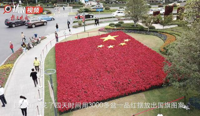 扬子晚报讯(记者 刘浏)国庆期间,一幅由3000盆花卉拼出的五星红旗图案出现在鼓楼广场西侧的绿地上,与广场中心环岛上的孔雀绿雕形成呼应,共同庆祝中华人民共和国成立70周年。记者了解到,国庆前夕,园林工人花了四天时间用3000多盆一品红摆放出国旗图案,这也是由花卉组成的国旗图案首次亮相南京街头。