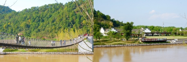 爬上离小吃店不远处的石阶,再通过吊桥,可以达到剡溪那一边,那里有水上戏台、儿童游乐区和茶馆、民舍、小酒馆等休闲之处。