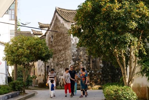 在施家岙村里游玩的客人