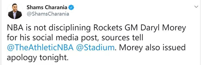 此外,据著名NBA记者Shams·Charania透露,NBA官方并不会对莫雷此前的涉港言论进行处罚。