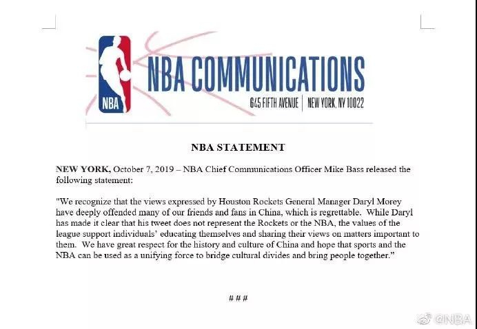 NBA首席传播官迈克尔·巴斯表示:“我们对休斯敦火箭队总经理达瑞尔-莫雷发表的不当言论感到极其失望,他无疑已经严重地伤害了中国球迷的感情。莫雷现已澄清他的言论不代表火箭队和NBA的立场。在NBA的价值观下,人们可对感兴趣的事情深入了解并分享自己的看法。我们极其尊重中国的历史与文化,希望体育和NBA作为一股团结的正能量,继续为国际文化交流搭建桥梁,将人们凝聚在一起。”
