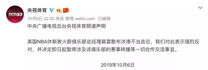 昨天(10月6日),中华人民共和国驻休斯敦总领事馆发言人发表谈话。中国篮球协会、中央广播电视总台央视体育频道、浦发银行信用卡中心、李宁品牌、腾讯体育等相继发表官方声明,宣布暂停或终止与火箭队的相关合作。