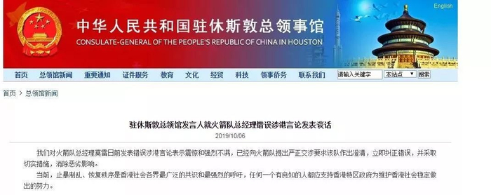 其中,中华人民共和国驻休斯敦总领事馆发言人就火箭队总经理错误涉港言论发表谈话称:“我们对火箭队总经理莫雷日前发表错误涉港言论表示震惊和强烈不满,已经向火箭队提出严正交涉要求该队作出澄清,立即纠正错误,并采取切实措施,消除恶劣影响。当前,止暴制乱、恢复秩序是香港社会各界最广泛的共识和最强烈的呼吁,任何一个有良知的人都应支持香港特区政府为维护香港社会稳定做出的努力。”