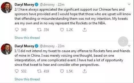 接着,他在第二条推文中写道:“我一直感谢我们中国的球迷以及赞助商的大力支持,我希望那些感到不快的人了解到,冒犯或误解他们并不是我的本意。我的推文仅代表个人观点,与火箭队或NBA无关。”