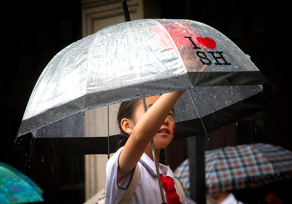 图说:在中共一大会址,孩子们冒雨等候国庆升旗仪式。唐智傲(上海大学新闻传播学院学生)摄