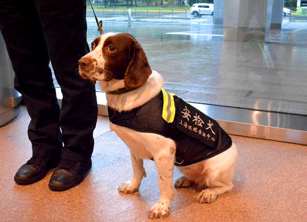 图说:上海环球金融中心执勤的安检犬 陆菁 摄