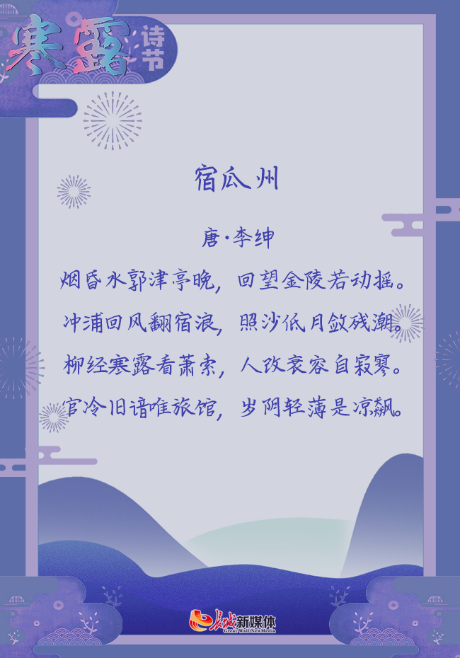 赏析:这个秋日,诗人行宿爪州,感慨羁旅寂寞。寒露时节的柳条十分萧索,人也空颜衰老,倍感寂寥。仕途不顺最熟悉的是旅馆,这凉风最让人感到岁月凉薄。