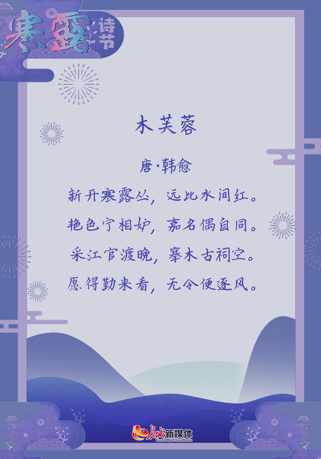 赏析:这首诗写木芙蓉花。芙蓉,因其花皎若芙蓉出水,似莲花展瓣,故名“木莲花”,而莲似芙蓉,又名“水芙蓉”,两者名归一宗,所以词中才有“认同宗,莲与芙蓉”。又莲生于水,故曰“水间红”,芙蓉开于晚秋,可谓天生“寒露中”。芙蓉丰姿艳丽,占尽深秋风情,又名“拒霜花”。芙蓉临水,波光花影,相映成趣,若芦枫为伴,则更相得益彰。