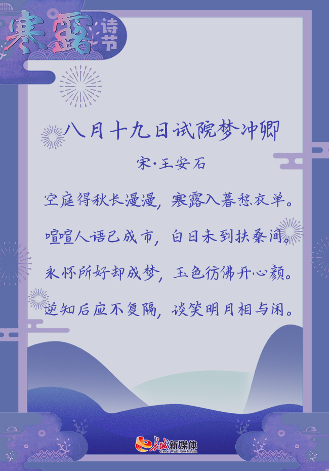 赏析:寒露时节,王安石在庭院之中,感慨秋日漫漫,寒露来了,身上的衣服也觉得单薄。这样的夜中,王安石想起了自己的好友。在这样一个深秋时节,许多人同王安石一般,会想念友人,在这样的深秋中,愿友人珍重自己,好待来日相见。