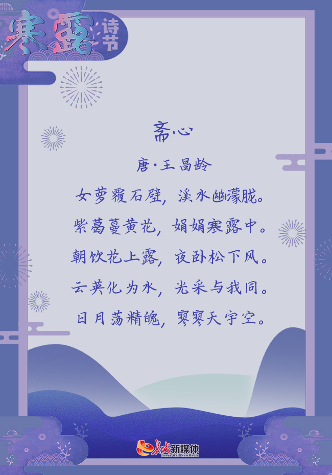赏析:这首诗是王昌龄在山中修炼时所写,女萝等植物覆盖了石壁,溪水幽幽地流着。紫葛、菊花在寒露时娟娟地开放着。早晨喝花上的露水,晚上就静卧在松下,享受轻风。在这样的环境中,王昌龄说,日月洗涤了我的魂魄,天空寰宇都倍觉空阔。