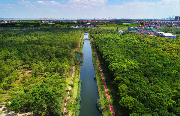 图说:塘湾村的蓝色水道、绿色林道和健身步道交相辉映。刘歆 摄