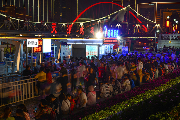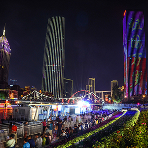 夜幕降临后的天津海河比白天还要繁忙,两岸高楼华灯初上,装饰着彩灯的游船不时驶过,缓缓在已被四周灯光映照如流霞的水面上划出道道波纹,行人驻足在津湾广场的亲水平台,或是解放桥、大光明桥这几座横跨在海河最耀眼一段的桥梁上,不断用手机或是相机记录着眼前流光潋滟的夜景。