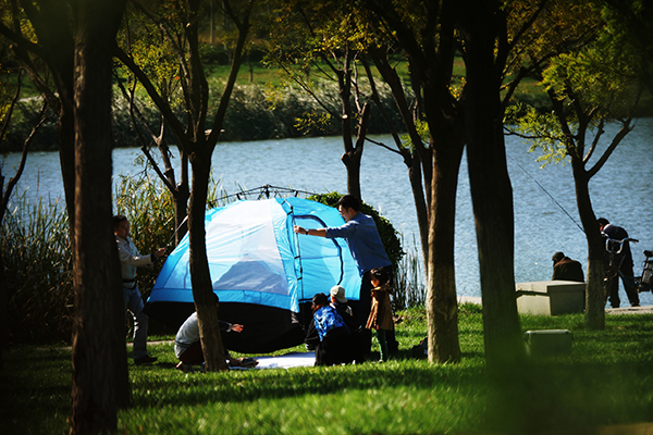 他说的没有错,举目望去,河边尽是三三两两的钓鱼人,或是像我们这样,漫步水边,吹着凉风,闲看风景的游人,走不多远,还遇到将海河作为基地的游泳俱乐部,趁着秋意尚浅,在河水中畅泳。而快抵达火车站时,河岸边更是出现了连绵而宽阔的绿化公园,是新建成的1.4公里景观带。傍晚时分,已经有不少人在其中休憩、运动。当地朋友也告诉我,只要住得离海河不太远,亲水平台修建好后,海河边的散步已经成了日常的健身活动。