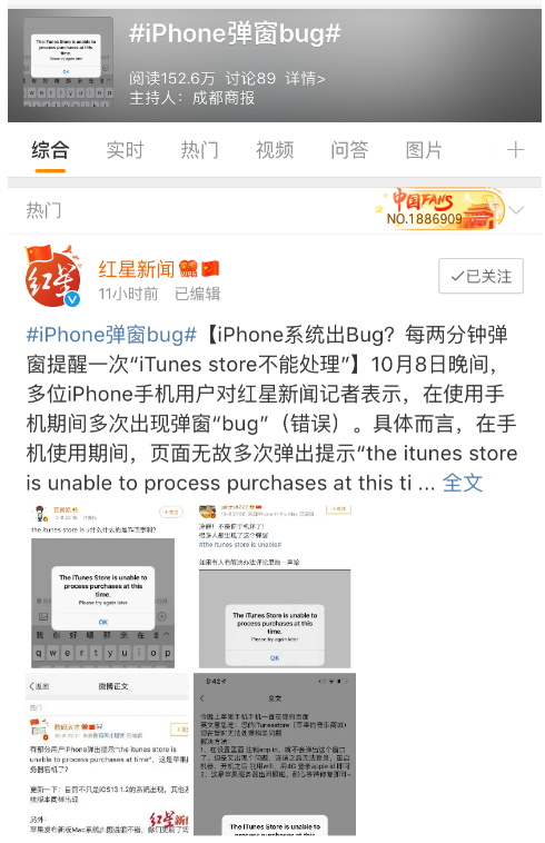 10月8日晚间,多位苹果手机用户对红星新闻记者表示,在使用手机期间多次出现弹窗“bug”(错误)。“苹果手机弹窗Bug”一度成为微博热搜,网友大呼“原来我不是一个人”。