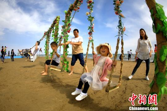 游客在博斯腾湖畔体验荡秋千。 何阳 摄