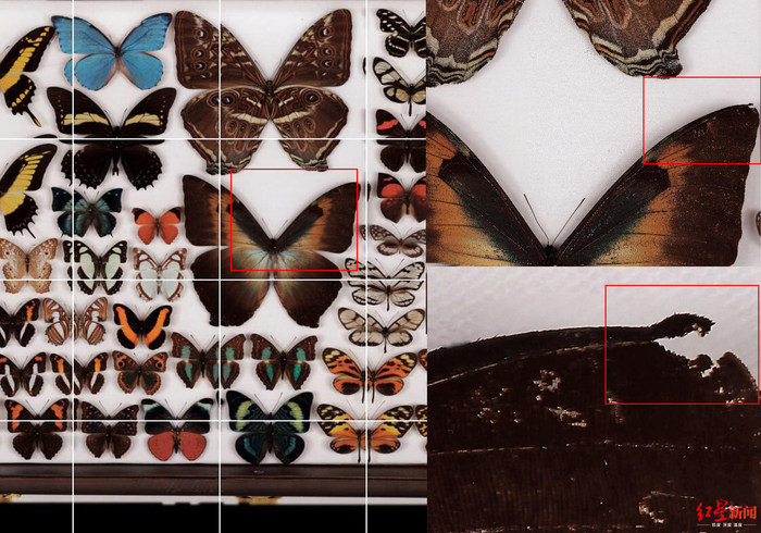 红星新闻点开了其中一格画面。当分级放大,点开照片后,原本看起来一盒普通的昆虫标本展现出惊人的细节——蝴蝶翅膀上鳞片的排列、蚂蚁身上的细毛、竹节虫触角的结构等均清晰可见。