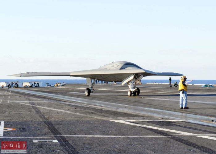 美军于2011年首飞的X-47B舰载隐身无人战机也采用飞翼设计。图为美军X-47B上舰测试资料图。