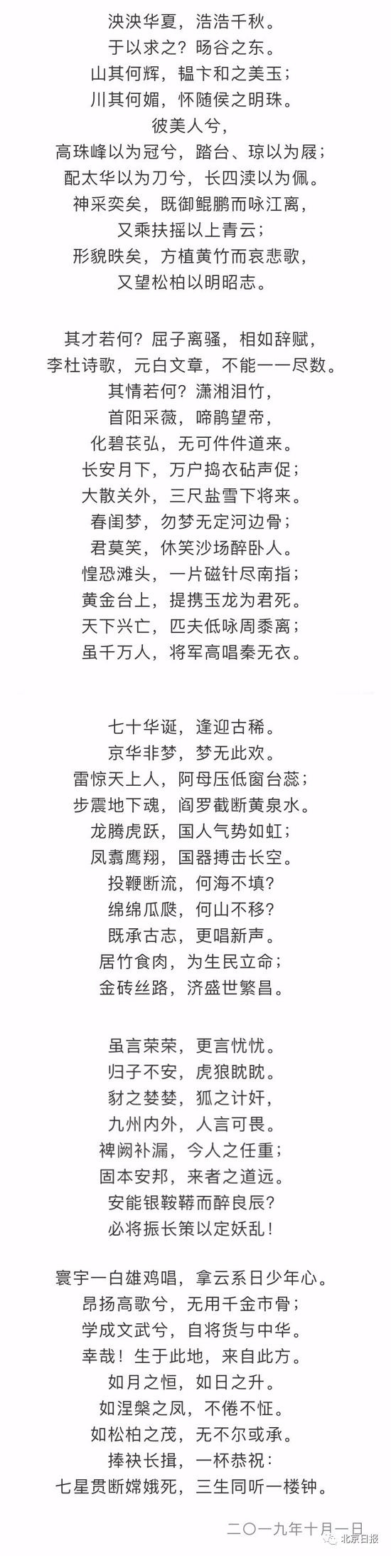十月一日当天,父女两人看完阅兵后,心情澎湃不已。刘显文晚上带着女儿和战友聚餐,谈的话题也都是阅兵。“吃完饭后,孩子就拿着手机鼓捣,我也没在意,结果两个小时后,孩子传给我了这篇《七十华诞阅兵赋》。”