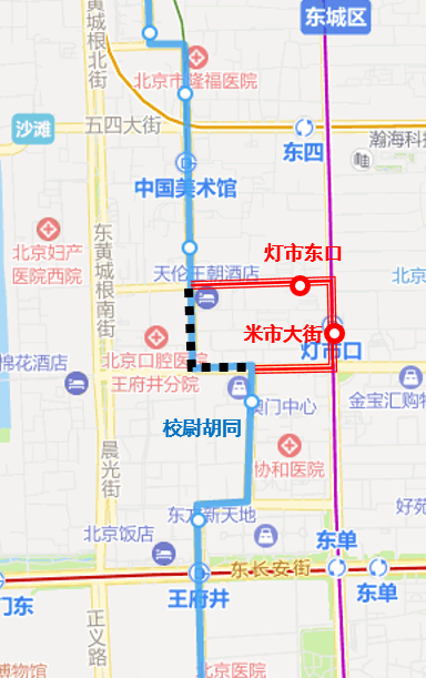 沿原路由至灯市西口,改行灯市口大街、东四南大街、金鱼胡同返回原线行驶。增设“灯市东口”“米市大街”站,原“新东安市场”站更名为“校尉胡同”。