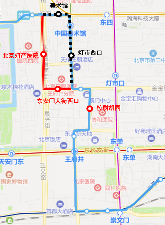 由动物园枢纽站发出,沿原路由至沙滩路口,改行北河沿大街、东安门大街、金鱼胡同返回原线行驶。增设“北京妇产医院”“东安门大街西口”“校尉胡同”站,取消“美术馆”“灯市西口”站。