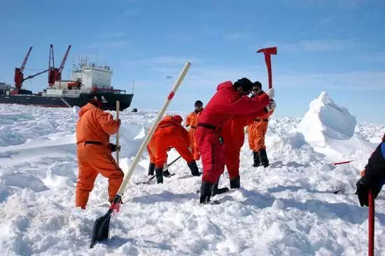 2005年1月8日,中国第21次南极科考队队员在南极开凿冰面进行科学考察