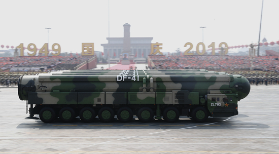 10月1日上午,庆祝中华人民共和国成立70周年大会在北京天安门广场隆重举行。图为东风-41核导弹方队接受检阅。新华社记者 刘彬/摄