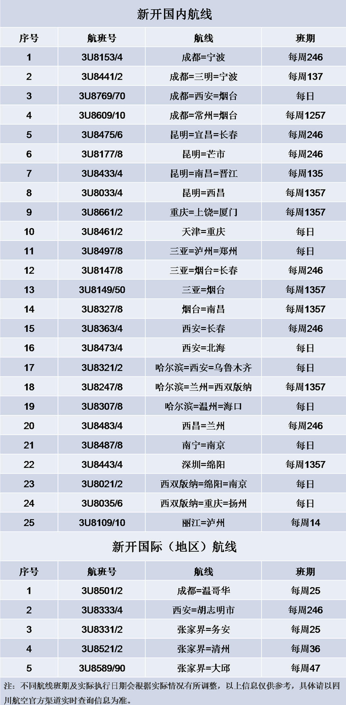 值得一提的是,川航长春=宜昌=昆明、长春=烟台=三亚、哈尔滨=温州=海口、哈尔滨=兰州=西双版纳等航线的开通,将为北方旅客温暖过冬提供更多选择。