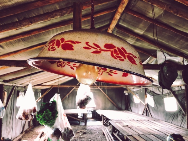 结束小火车的旅程后,司机带我们去林业工人的帐篷转了一圈。那里有两台废弃的爬山虎——J50型林业用拖拉机,又粗又长的木头挂在后面,仿佛当年叱咤风云的模样。帐篷里生着炉子,灯罩是用脸盆做的,大通铺像火烧赤壁中的浮桥。衣服和熏肉都挂在绳子上,怕被虫子吃了。“这可是电影《莫尔道嘎》的拍摄地呢!”他有几分得意。