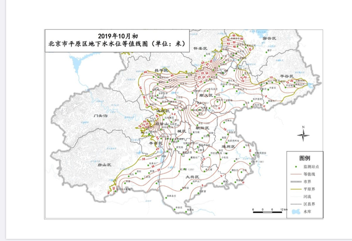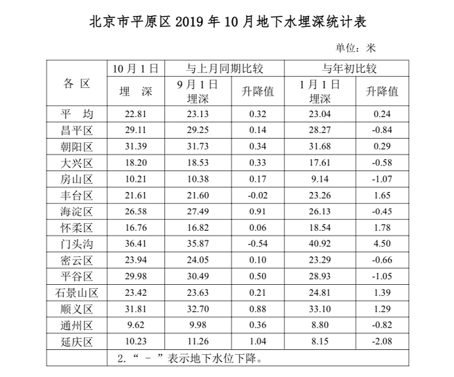 根据市水务局水文总站的监测,今年10月1日,北京市平原区地下水埋深平均为22.81米,与上月同期比较,地下水位回升0.32米,地下水储量增加1.6亿立方米;与上年同期相比,地下水位回升0.63米,地下水储量增加3.2亿立方米。16区的地下水位也有不小变化,和上月同期比较,全市有10个区地下水位回升,其中延庆区回升值最大,为1.04米,其次为海淀区,回升值为0.91米,怀柔区回升值最小,为0.06米,其他7个区回升值介于0.10至0.88米之间。