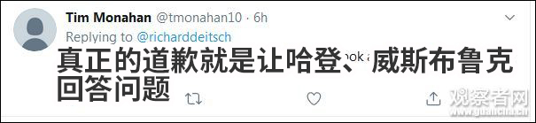 而10日坐在哈登边上的威斯布鲁克,也就是哈登7日“道歉”时站在他身边的那位。