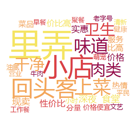4.在点评关键词中,出现频率最高的是 “里弄小店”(关于店铺位置和规模的名词)以及 “回头客”(顾客身份的名词),其次是关于就餐体验的形容词,如“味道佳”、“价格实惠”等。可以看出,顾客首先注意到的是店铺的空间特色,其次是商品的特色。