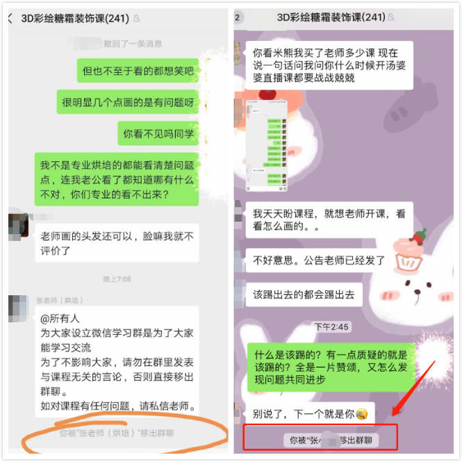 越来越多的学员质疑张老师涉嫌虚假宣传蒙骗学员,据刘女士介绍,随着质疑声越来越多,对提出异议的学员,张老师就把其踢出群聊,“我自己也被踢了。”