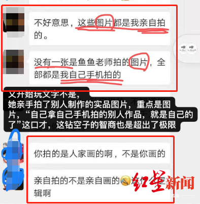 在一张群聊天截图中,红星新闻记者看到张老师对此作出解释:“这些图片都是我亲自拍的,没有一张是鱼鱼老师(南京老师)拍的图片,全部都是我自己手机拍的。”有人对此提出质疑,“亲自拍的不是亲自画的,这什么逻辑啊?”