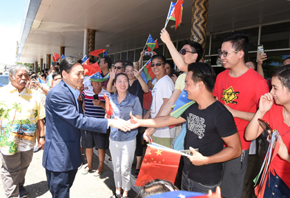 9月29日,薛大使抵达所罗门群岛首都霍尼亚拉时,所执政联盟代表、矿业部长托沃西亚到机场迎接。数百名华侨华人、中资企业员工及当地百姓聚集在机场,迎接薛大使的到来,他们手持五星红旗,高喊中华人民共和国万岁,发自内心地热烈欢迎中国大使。薛大使此访旨在落实中所建交后双方共识,推动两国多领域合作。