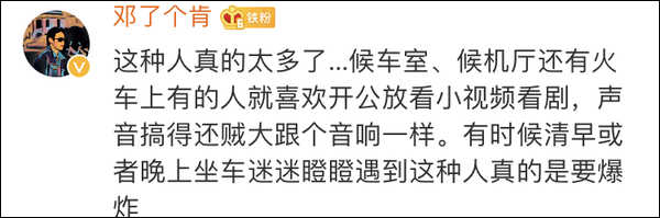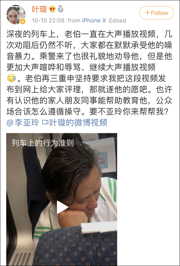 10月10日22时许,@叶璇 在微博发布视频称,深夜的列车上有老伯一直在大声播放视频,几次劝阻后仍然不听,对于乘警的劝导也置之不理,继续大声播放视频,还坚持让她把视频发到网上让大家评理。