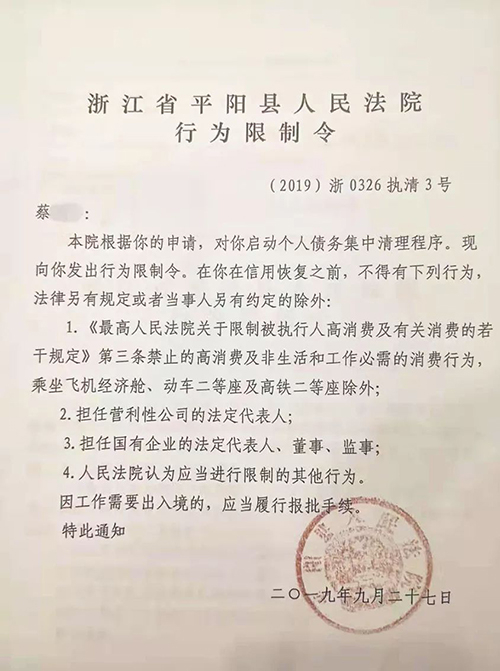 平阳法院对蔡某发出的行为限制令