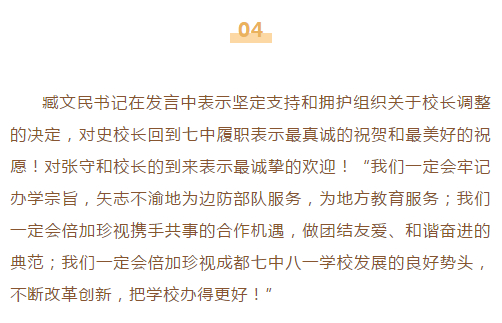 其一,今年8月26日,在成都七中八一学校召开的领导班子交接大会上,七八一学校党委书记臧文民对史玉川回到七中履职表示了最真诚的祝贺和最美好的祝愿。