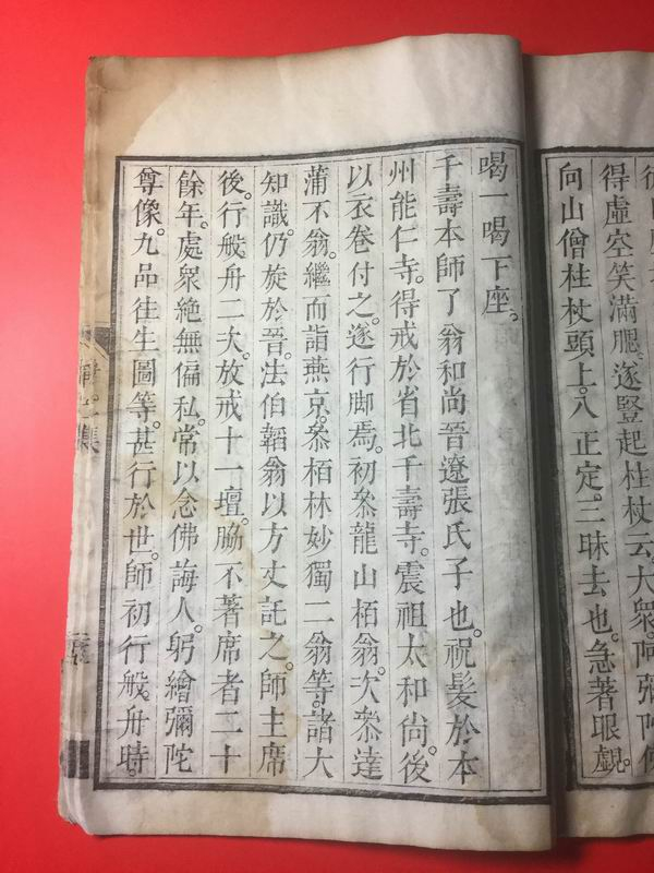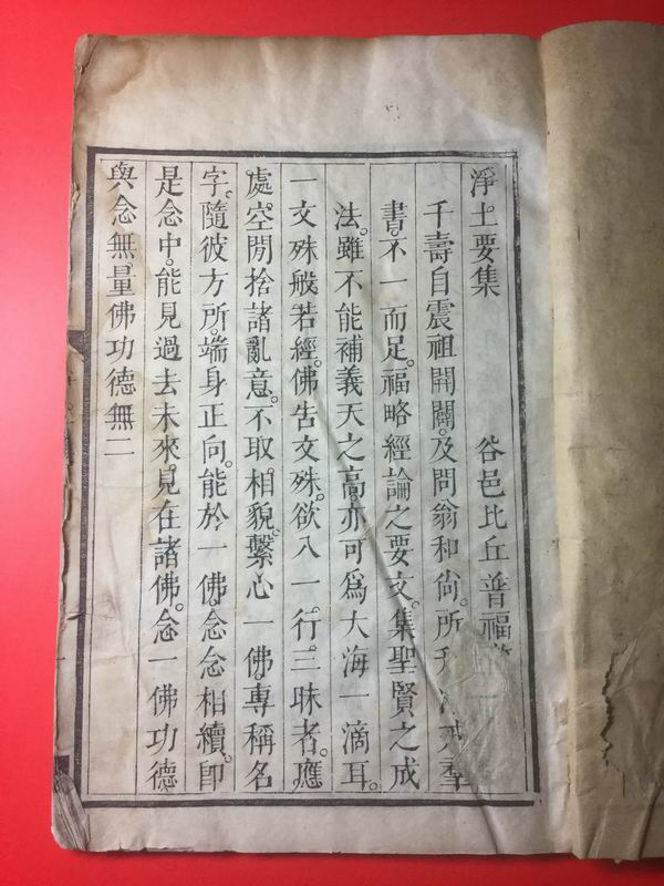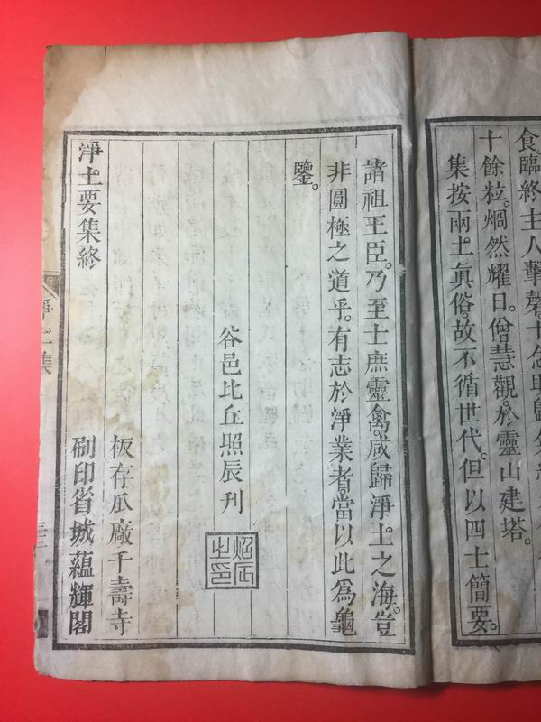 这部刻本是我最近从孔夫子旧书网购得的,书名是《净土要集》(下文简称《要集》),作者署名“谷邑比丘普福”(“福”字下面还有某字上部的残画,可能是“纂”字)。全书四周双栏,白口单鱼尾,每半页九行,行十八字,版心鱼尾下方刻书名简称《净土集》和叶码。全书共有三十二叶,六十四个半页。书尾还有刊记三行“谷邑比丘照辰刊,板存瓜厂千寿寺,刷印省城蕴辉阁”,但无刊刻时间。“谷邑比丘照辰刊”下面刻一阳文方印,印文是“照辰之印”。刊记里提到的“瓜厂千寿寺”,正是《宗统》记录的同一家千寿寺。所谓“瓜厂”,就是前引乾隆重修《太原府志》里提到的千寿寺所在地“北关瓜厂”。在净土思想的弘扬方面,这部千寿寺刻本《净土要集》其实并无多少高明之处,但是从千寿寺史料的保存方面来看,它却是一份不能忽视的文献。这是因为《宗统》中著录的千寿寺一系的律师,前三世中竟有五人的名字都在这部书中出现了。