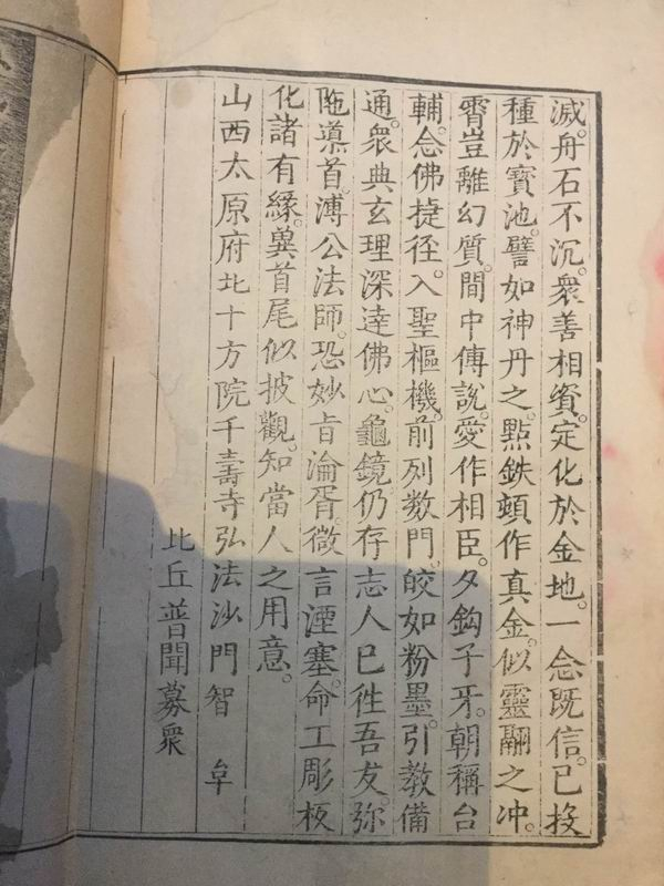 从柏山德楷的卒年(康熙四十一年,1702),独超超方住持柏林寺的年代(也是康熙四十一年前后),再加上了空从北京回山西后住持千寿寺二十余年,以及他的弟子祖瑛重修辽州石佛寺的时间(雍正十年,1732),还有雍正重修《辽州志》的时间(雍正十一年,1733,当时了空已经去世),我们基本上可以推定了空是康熙雍正时人。作为他的弟子,普福应该是雍正乾隆时的人,《净土要集》的编写也在这个时间段。但是从刻本的字体来看,其实际的刊刻时间似乎是在嘉庆和道光时期。由于刊记中“刷印省城蕴辉阁”这几个字的字体与全书明显不同,显然是在后来拿旧版重新刷印时新刻上去的,可见我手中这本的印刷时间就更晚了。