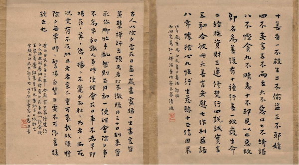 李叔同(1880~1942)在出家前,才华横溢的他就已在戏剧、绘画、书法、音乐、诗词等艺术领域享有了极高的声望。1918年出家后,他又成一位精进勤修、持律严谨的弘一法师,用他的“戒行”思想影响、感化了一代又一代人。他的书法除了技法精妙外,给人一种安静平和的感觉。叶圣陶先生曾评价其书法:“疏处不嫌其疏,密处不嫌其密,只觉得每一笔都落在最适当的位置上,不容移动一丝一毫。”