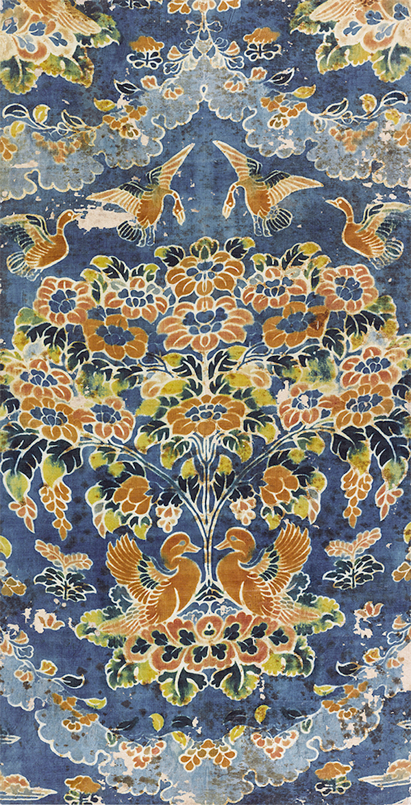 此为佛前供奉时桌上所铺之物。夹缬是一种印染技法,将绢织物紧紧夹在两块雕以对称纹样的木板中,进行染色,两板夹紧处染料无法染色,形成花纹。画面中的果树枝叶宽大舒展,树下莲花座上的水鸟色彩鲜明,结构左右对称。这是正仓院夹缬染织物中的代表作品之一。