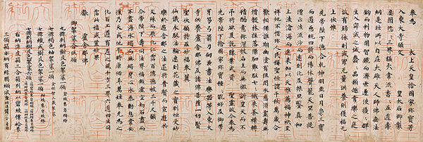 “东大寺献物帐”是以圣武天皇遗物为首的宝物向东大寺大佛献纳时的目录,为18张白麻纸相继粘贴而成,墨色鲜明,书风端正,全部钤印“天皇御玺”,卷末写有大意为“宝物为圣武天皇的遗物。想起过往之事,每每触目伤情,谨向卢舍那佛奉纳”的文字,表现了光明皇后对天皇的深爱,看到宝物就想起故去的圣武天皇,终日思念悲叹,伤心欲绝。