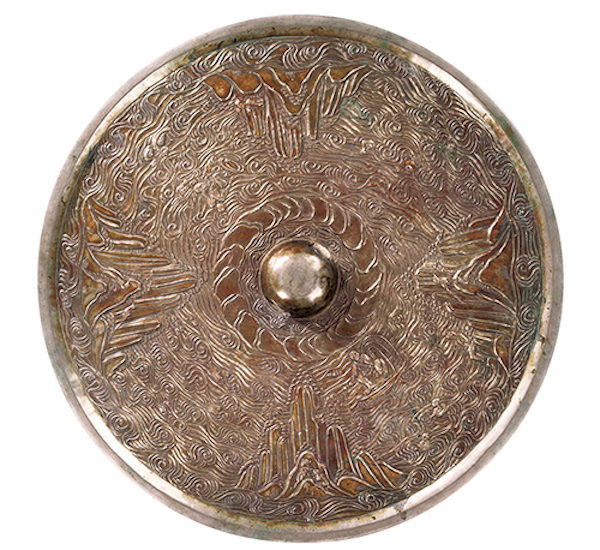 该镜为天平8年(736)2月22日(圣德太子忌日)光明皇后向法隆寺“丈六”佛供奉之物。镜背的四面为山的纹样,环以水波纹。此外,还有仙人和鸟等纹饰,所表现的主题应为与河、湖有关的神话传说。