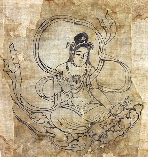 “墨画佛像”为两片麻布上下相接,描绘了乘云气,着天衣的菩萨形象。画面墨色深,运笔自由阔达。菩萨姿态端正,厚唇,双肩张开,手的表现富有肉感。该作品表现了深受中国盛唐时代影响的奈良时代的艺术风格,极具魅力。
