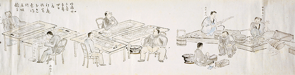 这幅作品描绘了宫内省图书寮在赤坂离宫进行的正仓院宝物修理的场景。作者稻垣兰圃在图书寮工作,应仿制正仓院宝物的稻生真履的要求所画。因为作品表现了当时的修理情况,所以非常珍贵。