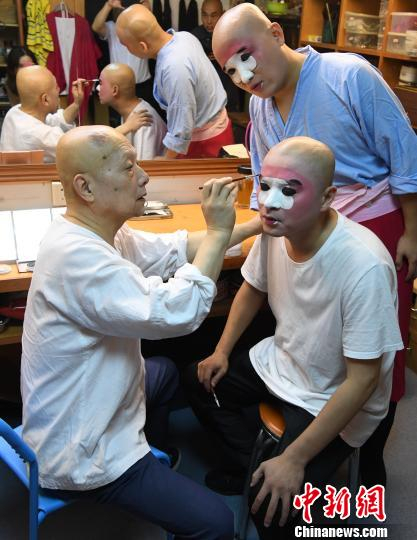 演出前,著名京剧丑角表演艺术家朱世慧为爱徒、福建京剧院二级演员张飞飞勾脸。 记者刘可耕 摄
