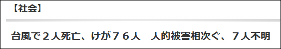 截至目前,因台风灾情导致2人死亡、76人受伤、7人失踪。此外,12日下午福岛核电站传出疑似输水管道泄漏消息,但东京电力稍后澄清泄漏警报因雨水引发。