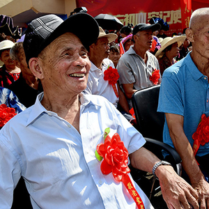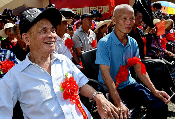 2019年10月7日,重阳节,福建省武夷山市兴田镇西郊村举办乡村敬老节,全村300多位60岁以上的老人戴着大红花,在家人和乡亲的陪伴下度过了一个快乐的节日。 新华社记者 张国俊 摄