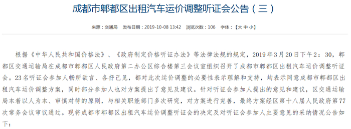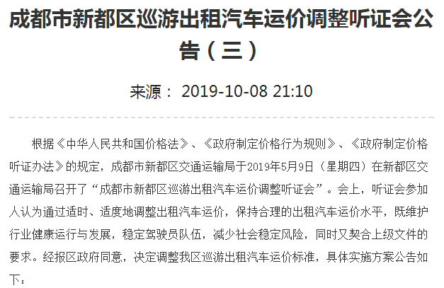 按照《成都市中心城区巡游出租汽车区域融合改革实施方案》(成交发〔2019〕37号)文件要求,巡游出租汽车新运价从2019年10月15日零时起执行。